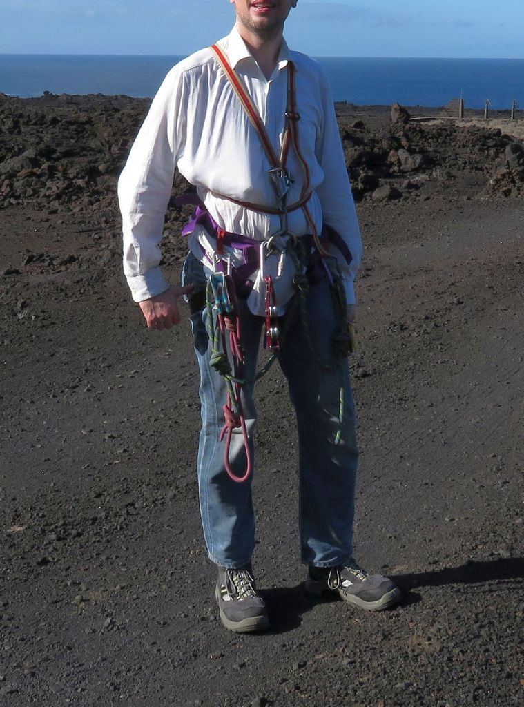 Eine Tradition von mir ist, mit einem weißen Hemd in Höhlen zu gehen. Der Ursprung liegt lange zurück: An einer Höhle in Frankreich meinte mein Vater einmal, dass diese durch einen Fluss, der bei Regenfällen hindurch strömt, so sauber ist, dass nicht mal ein weißes Hemd dreckig werden kann. Zufälligerweise hatte ich damals eines dabei gehabt und machte den Test. Sein Versprechen hielt knapp 150 Meter, danach drehte ich um, sonst hätte ich auch gleich nackt weitergehen können. Da wir manchmal kürzere Höhlen ansehen, wo kein Klettern oder Kriechen nötig ist, oder warme Höhlen wie auf den Kanaren, wurde aus meinem „Weißen-Hemd-Test“ eine Art Tradition. Zugegebenermaßen nutzte ich dafür gerne die Hemden meiner (Ex-)Arbeitgeber, schön mit deren Logos drauf. Einmal postete ich ein entsprechendes Bild und mein Ex-Chef lobte mich dafür, dass ich sogar noch im Urlaub und an außergewöhnlichen Orten Werbung für seine Firma trage. Bis er sah, wie das Hemd nach dem Einsatz aussah … Immerhin, die Höhlenspinnen haben so zum ersten Mal in ihrem Leben Werbung gesehen.