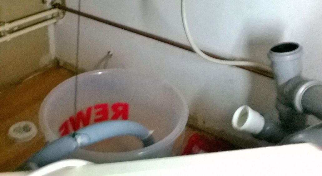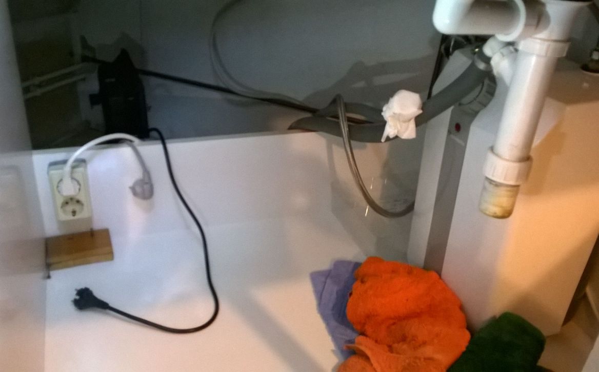 Voller Begeisterung überlegte ich nun, ob ich mein Geschirr im Badezimmer-Waschbecken, in der Dusche oder gleich im Klo waschen sollte. Die Küchen-Spüle fiel heraus – dasselbe Rohr. Dank meiner grenzenlosen Faulheit kam ich auf eine geniale Idee: Warum soll ein kaputter Ablauf den Geschirrspüler daran hindern, seinen Dienst zu tun? Ich muss ja nur das Abwasser umleiten … was nun folgte, hatte Ähnlichkeit zu den Trocknungs-Sessions im Auto: Immer wenn der Geschirrspüler lief, saß ich mit einem Buch daneben. Und sobald die Abwasser-Pumpe ansprang, hielt ich den Abwasser-Schlauch in einen Eimer. War dieser voll, rannte ich zum Klo, entleerte ihn und schoss zurück. Seitdem weiß ich, dass 1x Abpumpen ganz knapp rein passt – 10 Liter. Das war zwar kein wassersparendes Modell, aber zumindest ein Schulunterricht auf praktische Art.