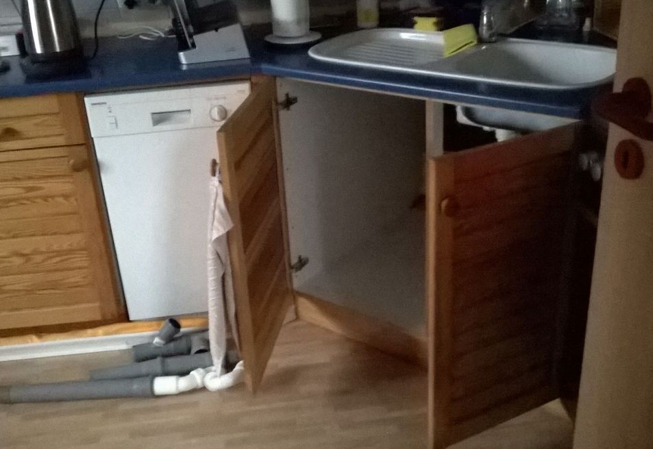Wie gewohnt war der Geschirrspüler voll gewesen und ich hatte diesen eingeschaltet. Während im Auto Heizlüfter und Föhn ihr Äußerstes zum Trocknen taten, saß ich in der Küche, weil von dort der Blick zum Auto am besten war und es Anfang Januar einfach kalt draußen ist. Ich wollte ja sehen, ob mein Auto statt abzusaufen möglicherweise nun abbrennt. Und plötzlich piepte es laut. Feuermelder-Fehlalarme kennt jeder – aber das Geräusch konnte ich zuerst überhaupt nicht zuordnen. Schließlich kam es von unten. Und ich hatte vergessen, dass ich den scheinbar überflüssigen Wassermelder (da Katze tot) an einer Stelle positioniert hatte, wo der Abwasser-Schlauch vom Geschirrspüler in der Wand verschwand. Der Anschluss war tief unter der Spüle und nur durch Kriechen zu erreichen. Während ich so über das Geräusch und dessen Ursprung sinnierte, sah ich einen kleinen Bach aus Dreck auftauchen, der unter dem Küchenholz hervor lief und sich freudig seinen Weg durch die Küche bahnte. Mit der Erinnerung meiner eigenen Wasser-Erlebnisse und der meiner Vermieterin schaffte ich es in Rekordzeit, die Pumpe des Geschirrspülers zu stoppen, unter die Spüle zu fliegen und alles an greifbaren Handtüchern auf den Boden zu werfen. Wie sich herausstellte, war der Abwasser-Schlauch zwar noch fest mittels der Manschette mit dem Stutzen verbunden, doch das Abwasser quoll überall an den Seiten heraus.