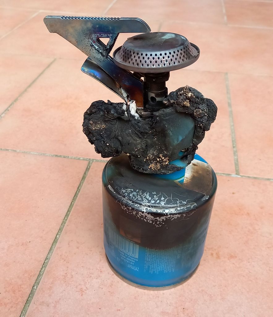 Ich wartete – lange. Es dauerte eine knappe Stunde, bis auch die letzten Flämmchen erloschen waren. Wie soviel Gas in so einer kleinen Kartusche sein konnte, war mir ein Rätsel. Bumm hatte es nie gemacht und die Kartusche sogar ihre ursprüngliche Form behalten – Respekt an die Erfinder! Nur der Brenner … ein geschmolzenes Trauerspiel. Mit einem Stock stocherte ich in den geschmolzenen Plastik- und Metall-Resten herum. Nichts explodierte, nichts brannte mehr. Ich wagte mich mit den Händen an die Überreste und schaffte es sogar, Kartusche und Brenner voneinander zu trennen. Auf der Rückfahrt nach Hause entschied ich, dass kalte Mahlzeiten viel leckerer sind. Und sicherer.