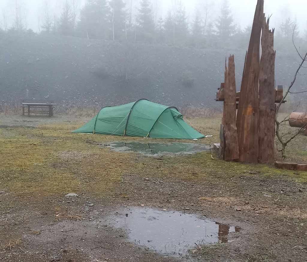 Das konnte ich nicht auf mir sitzen lassen und lud zu meinem 40. Geburtstag in den Harz ein. Zum Zelten, im Dezember. Genauer gesagt, am 23.12. Erstaunlicherweise kamen sogar 4 Gäste, darunter mein Vater, aber 2 davon schliefen dann doch in einem Haus. Wobei man dazu sagen muss, dass dieses Haus keine Komfort-Wohnung war, sondern eine Höhlenforscher-Behausung, die größtenteils von Männern genutzt wurde und wo man sich sein Bett (Isomatte) selbst mitbringen musste. Aber immerhin war es wärmer als draußen. Dort herrschte zu der Zeit keine extreme Kälte, mit um die 0 Grad war es akzeptabel, aber schlafen ging nur mit Handschuhen, Mütze und viel Kleidung. Deutlich problematischer war der viele Regen, denn dies brachte nach 3 Tagen Zelten ein sehr gravierendes Problem mit sich: Ein neu entstandener See um mein Zelt. Hier noch im Aufbau: