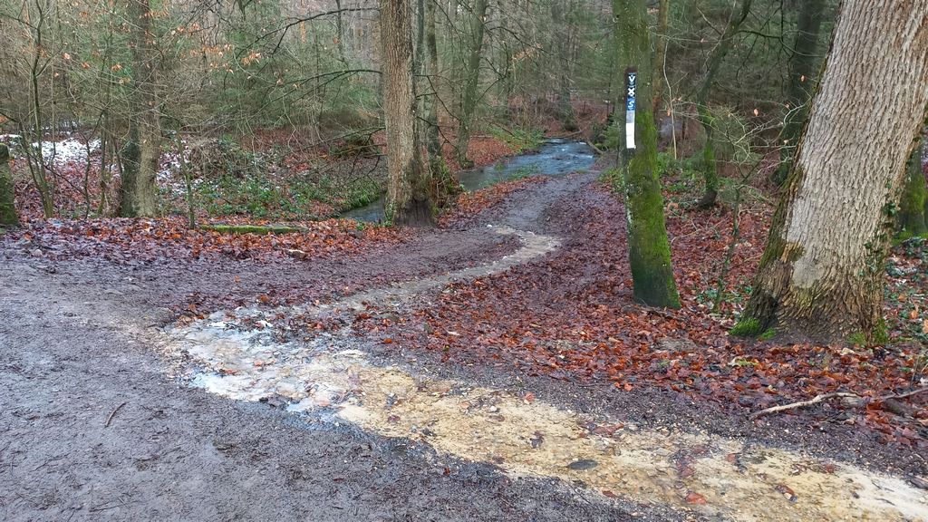 Um das Wandern spannender zu machen, bevorzuge ich kleine, unbefestigte Pfade wie Grenzwege. Alles, was in OpenStreetMap gepünktet angezeigt wird, ist super. Solche Wege haben eine Gebüsch- und Such-dir-deinen-Pfad-selbst-Garantie. Perfekt ist zudem bergiges Gelände wegen dem steilen Gefälle. Auch spaßig sind Mountainbike-Trails; ja, die soll man nicht zu Fuß gehen, machen aber besonders viel Spaß. Denn hier gibt es Matschgarantie, steile Rampen und viel Rutschgefahr. Einen Tag vor Weihnachten fährt da sowieso niemand lang. Sightseeings gibt es auf meinen Touren auch: