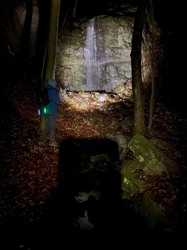 Kann man das toppen? Yes. Ich habe ja im Dezember Geburtstag, und da wird es früh dunkel. Was liegt also näher als eine Nachtwanderung! Somit starten meine Touren in der Dämmerung und gehen bis tief in die Nacht. Unser Rekord war von 16 – 24 Uhr: Es war angenehm warmes Wetter, die Truppe sehr motiviert und der Alkohol-Pegel bestens. Denn für die gemütliche Einkehr zwischendurch achte ich darauf, dass Schutzhütten auf der Wanderroute liegen. Keine bewirtschafteten, sondern die offenen Holzhütten, in denen Wanderer im Sommer ein Päuschen machen können. Im Notfall tut es aber auch eine Bank. Damit die Kälte besser auszuhalten ist, sind warme Getränke Pflicht: Glühwein, Grog, Met, Glühbier, … . Doch Klimawandel sei Dank waren die letzten Male kalte Biere angenehmer. Und natürlich die obligatorischen Kurzen. Das Ergebnis jeder Pause ist eine immer stärker motivierte Truppe, die jeden Sturz, jedes Matschbad und jede weitere Gemeinheit von mir mit Humor nimmt – oder noch einen trinkt und sich dann durch den Tannenwald drückt. Denn selbst Pfade sind mir manchmal zu langweilig. Querfeldein ist das neue Wandern! Falls du schonmal im Dunkeln versucht hast, ohne Weg durch einen dichten Nadelwald zu kommen, weißt du, wovon ich spreche. Man sieht eigentlich nix, aber kriegt ständig Äste ins Gesicht.