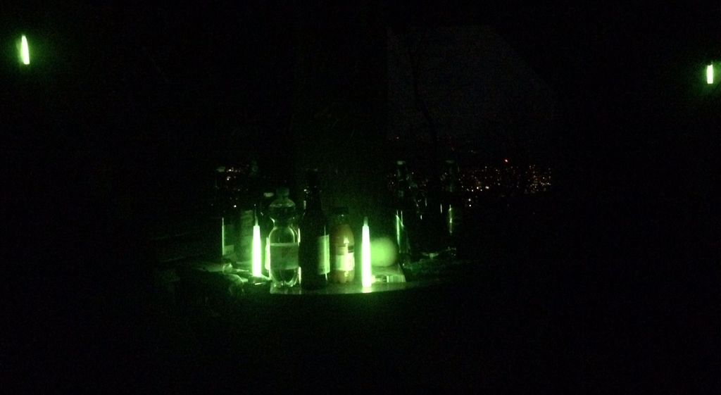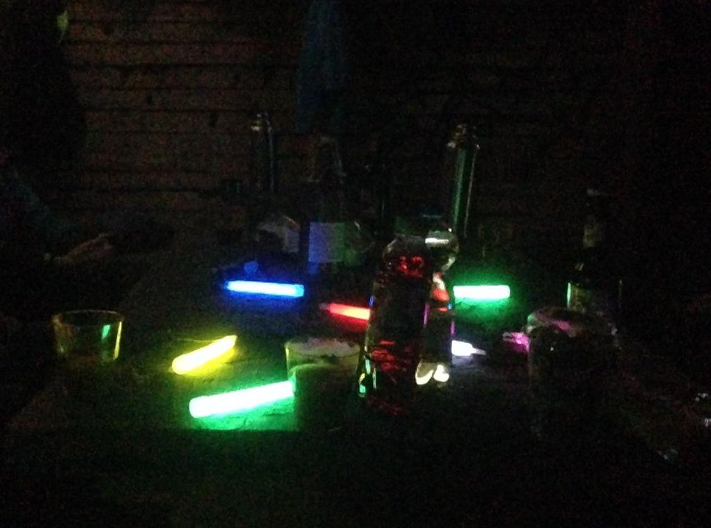 Dunkelheit ist relativ: Welche Mondphase haben wir gerade, wieviele Wolken gibt es? Vollmond ist langweilig, es ist oft viel zu hell. Geil ist hingegen Neumond, ein Garantiebringer für viele Flüche. Denn manchmal verbiete ich Taschenlampen. Damit wir nicht tastend auf allen Vieren oder händchenhaltend in einer Reihe losziehen müssen, bringe ich für diese Ausflugsvariation bunte Leuchtstäbe mit. Die leuchten hell genug, dass man bis zu seinen Füßen sehen kann, aber nicht weit genug, um die nächste Abbruchkante zu erkennen. Seitdem weiß ich auch: Gelb leuchtet heller als rot oder blau. Für Routen durch Steinbrüche und an Abhängen entlang sind Leuchtstäbe optimal, denn sogar Leute mit Höhenangst kommen mit.