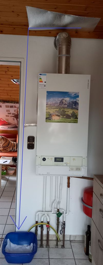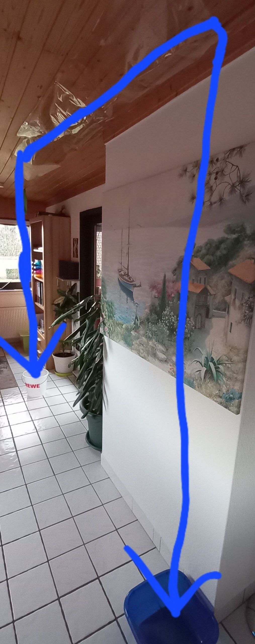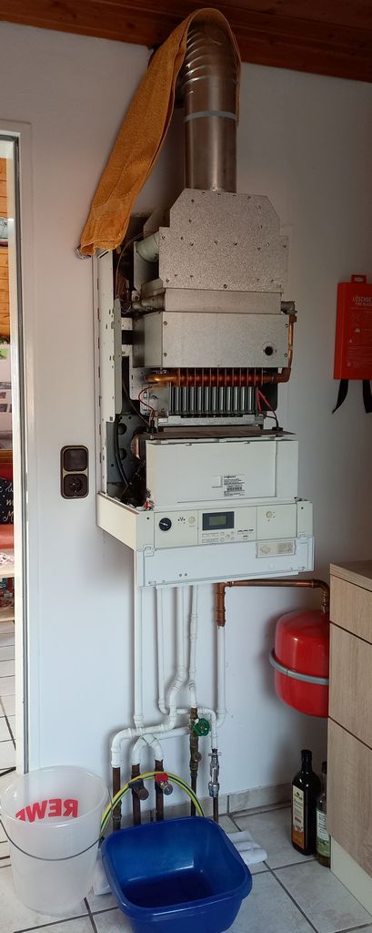 Doch das Wasser fand neue Wege: Im Winter 2023 während wochenlangem Regen und einer Hochwasser-Katastrophe der Weser entschied sich nun mein Dach, undicht zu werden. Ich taperte nachts auf Klo und wunderte mich, warum es so kalt in der Wohnung war. In der Küche, wo auch mein Heizgerät stand, fand ich einen See vor, der sich vom Dach durch meine Gastherme bis zum Boden vorgearbeitet hatte. Mein holzgetäfelte Decke war eine lebendige Tropfsteinhöhle geworden, meine Gastherme passenderweise oben offen und dadurch so geflutet mit Wasser, dass selbst das Display aufgegeben hatte. Immerhin hatte das Gerät gemerkt, dass es baden gegangen war, und in den Fehlerzustand gewechselt. Ich guckte ziemlich doof, schaltete Strom und Gas ab und ging wieder schlafen.