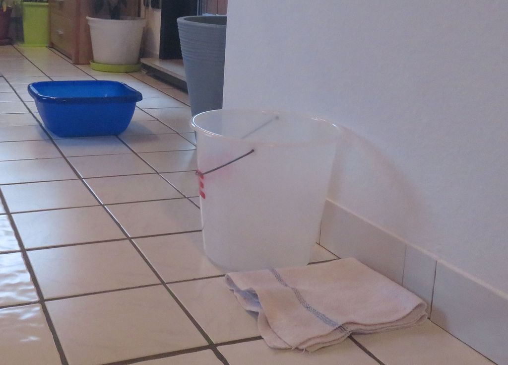 Die folgenden Monate wurden zu einem fröhlichen Wasser- und Behörden-Spiel: Während sich Handwerker bei der derzeitigen Wetterlage außer Stande sahen, das Dach zu untersuchen und zu reparieren, fand das Wasser immer neue Wege in meine Wohnung. Auf mehreren Metern Breite tropfte es mittlerweile bei Regen und Schnee rein, sowohl in der Küche wie auch im Wohnzimmer. Ich hatte kostenlos fließend Wasser und meine eigene Indoor-Regendusche. Erst stellte ich Eimer hin, dann Eurokisten, weil die Eimer viel zu wenig Fläche abdeckten.