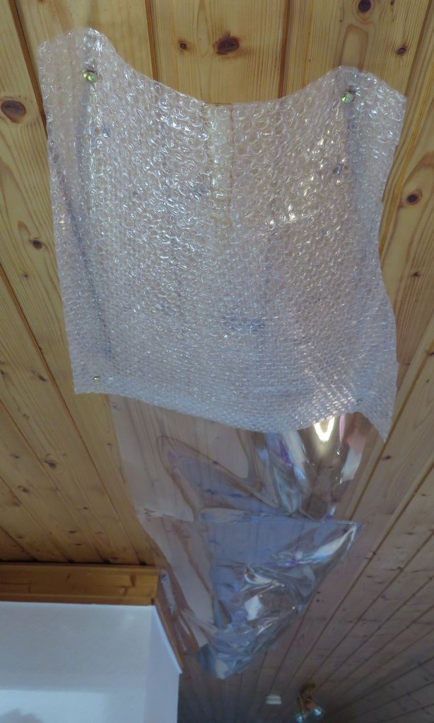 Als das Wasser an Stellen tropfte, wo empfindliche Elektrogeräte standen, baute ich über diesen Geräten einen Wasser-Umleitungsschutz aus Heizung-Reflexionsfolie. Soll es halt woanders tropfen, aber nicht in meine geliebten (wenn auch alten) Geräte! Außerdem hatte ich Sorge vor Kurzschlüssen und Bränden.