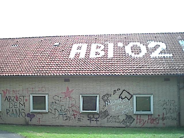 Jedenfalls malten wir unseren Abi-Schriftzug in fetter weißer Farbe aufs Dach. Alles ohne Abstürze, Brüche oder Tote. Danach ging die Party unten weiter, bis keiner mehr stehen konnte. Gepennt wurde direkt auf dem Rasen der Schule, das Wetter war optimal. Am nächsten Morgen betrachteten wir glücklich unser Werk …